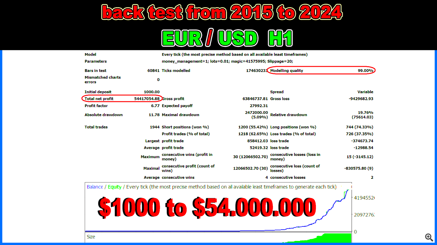 همه تنظیمات از قبل در مشاور تعبیه شده اند، بنابراین نیازی به هدر دادن زمان برای بهینه سازی ندارید. فقط مشاور را در ترمینال نصب کنید و آن را روی جفت ارز EURUSD اعمال کنید.