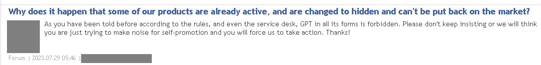 The OP (poster) had some of his products hidden because someone complained or he spammed them and there seems to be an anti spam bot that sends your product to be checked on the desk if you spam it . Pretty clever mechanism i like it , bravo mql5.com , step in the right direction there.