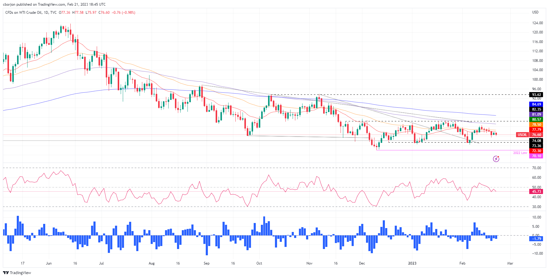 [ad_1] اشتراک گذاری: گمانه زنی ها برای انقباض بیشتر توسط فدرال رزرو پشتوانه دلار آمریکا است که باد مخالف قیمت نفت است. بازگشایی چین و انتظار روسیه برای کاهش تولید نفت، کاهش WTI را محدود کرد. تجزیه و تحلیل فنی WTI: خنثی به سمت پایین. زمانی که 75.00 دلار بشکند، احتمال دارد که