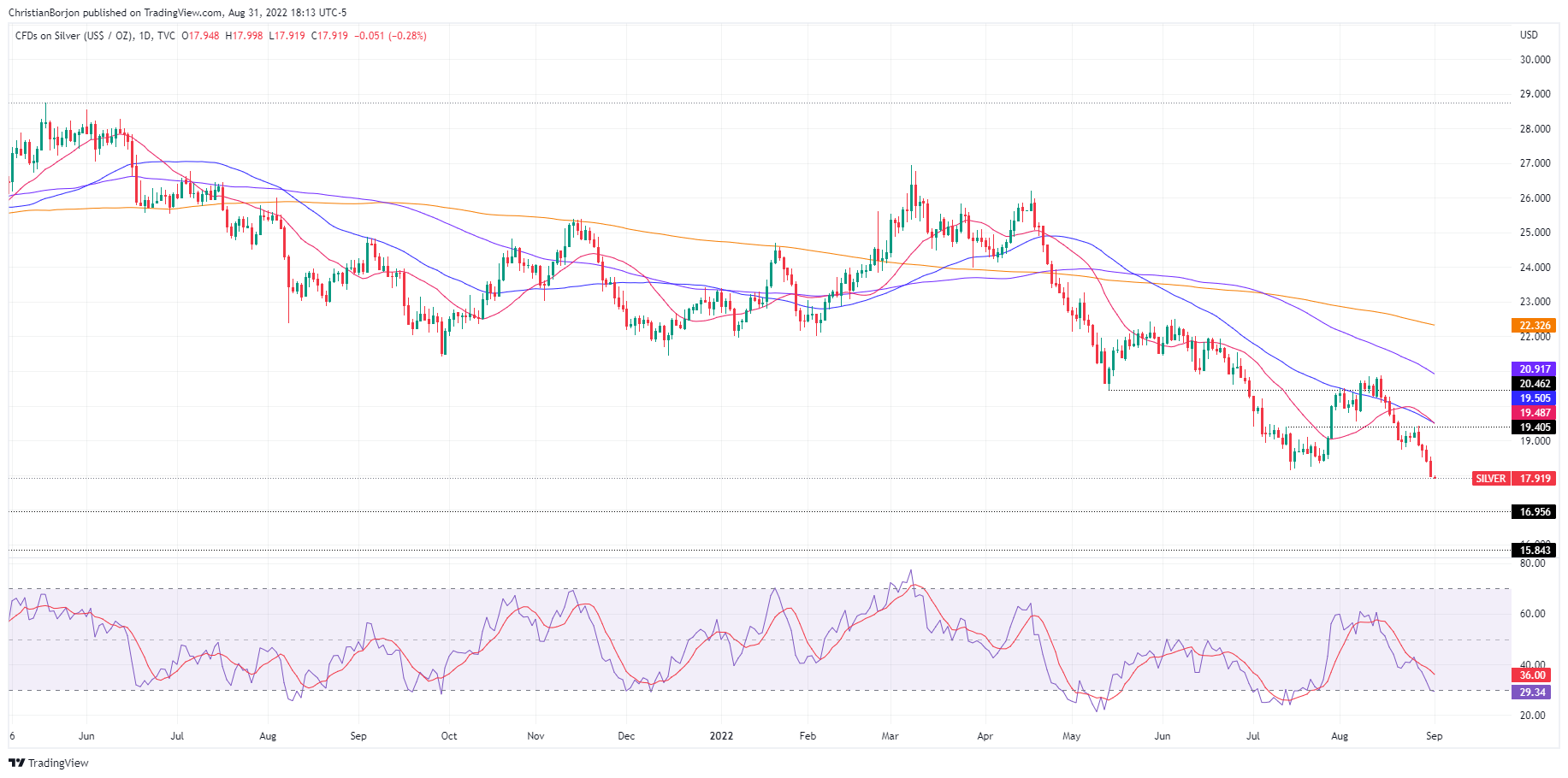 قیمت نقره برای چهار روز متوالی به شدت کاهش یافت و به پایینترین سطح سال تا به امروز (YTD) زیر رقم 18 دلار رسید، سطوحی که از ژوئیه 2020 مشاهده نشده است. XAG/USD با شروع جلسه آسیا و اقیانوسیه با قیمت 17.96 دلار معامله میشود، تقریباً پس از آن ثابت است. با افت 2.33 درصدی، در روز چهارشنبه به کمترین میزان در دو سال گذشته یعنی 17.91 دلار رسید.