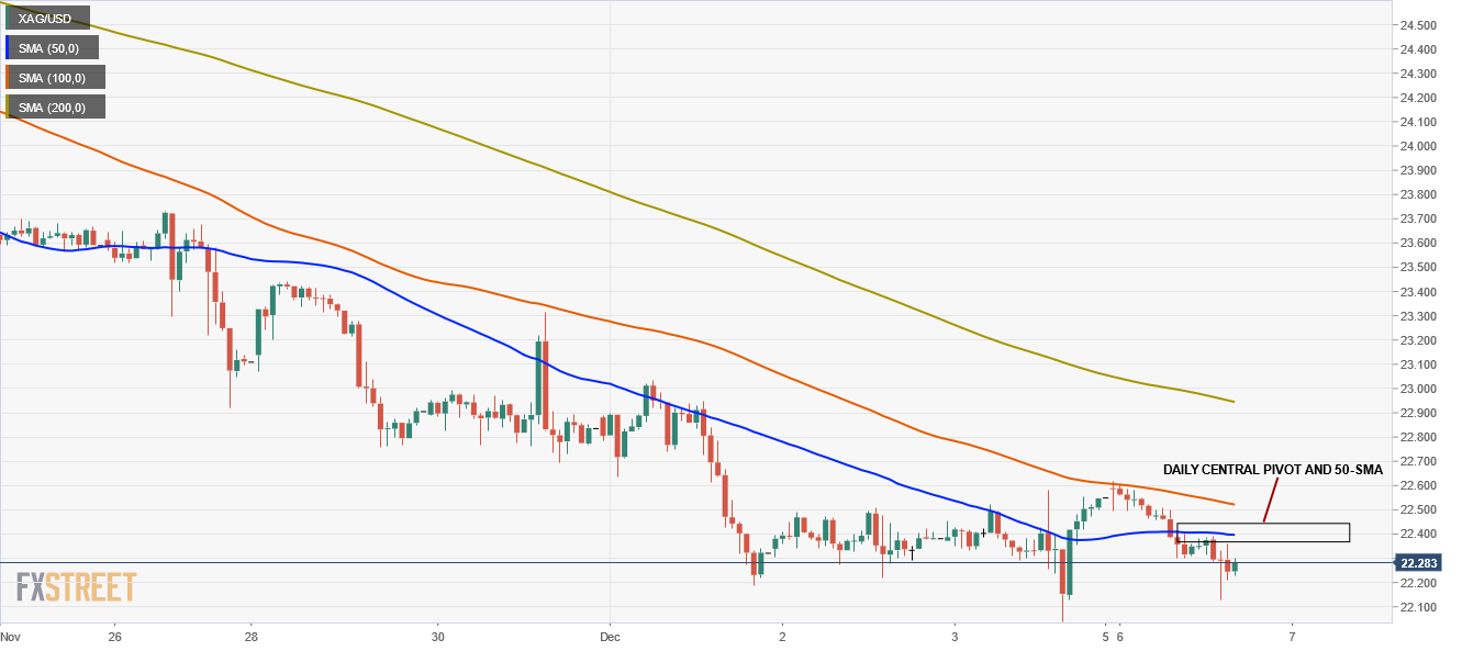 نقره (XAG/USD) در نمودار 1 ساعته، یک سوگیری نزولی را نشان میدهد که به میانگینهای متحرک ساده 1 ساعته (SMA) نسبت داده میشود که بالاتر از قیمت نقدی قرار دارند. همچنین، تلاقی 50-SMA و نقطه محوری روزانه در 22.37 دلار، که سه بار آزمایش ناموفق انجام شد، به نظر می رسد سطح فروش قوی برای خرس های XAG/USD باشد.