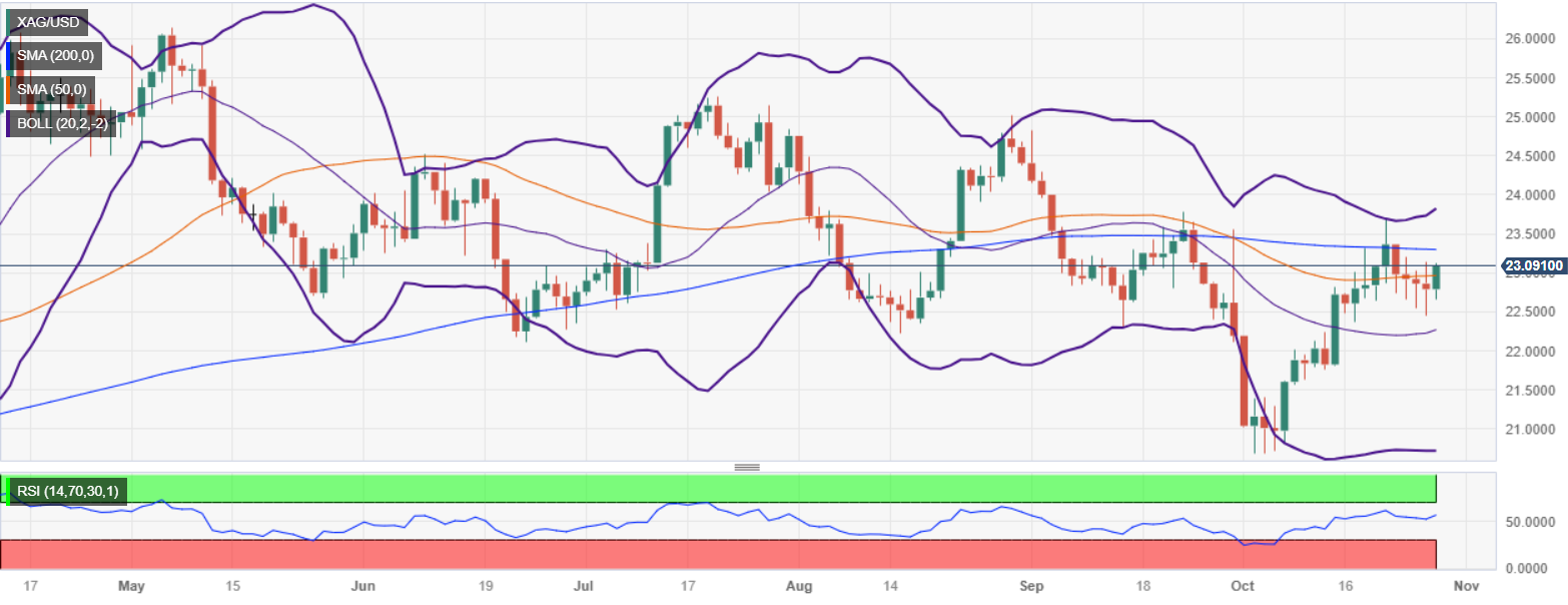 [ad_1] Share: Silver price jumps from $22.70 to $23.07, testing crucial resistance at 200-DMA of $23.26. A breach of 200-DMA could expose next resistance levels at $23.69 and Bollinger bands top at $23.80. If Silver falls below $23.00, supports are $22.94, $22.44, and 20-day EMA at $22.25. Silver price jumped above the $23.00