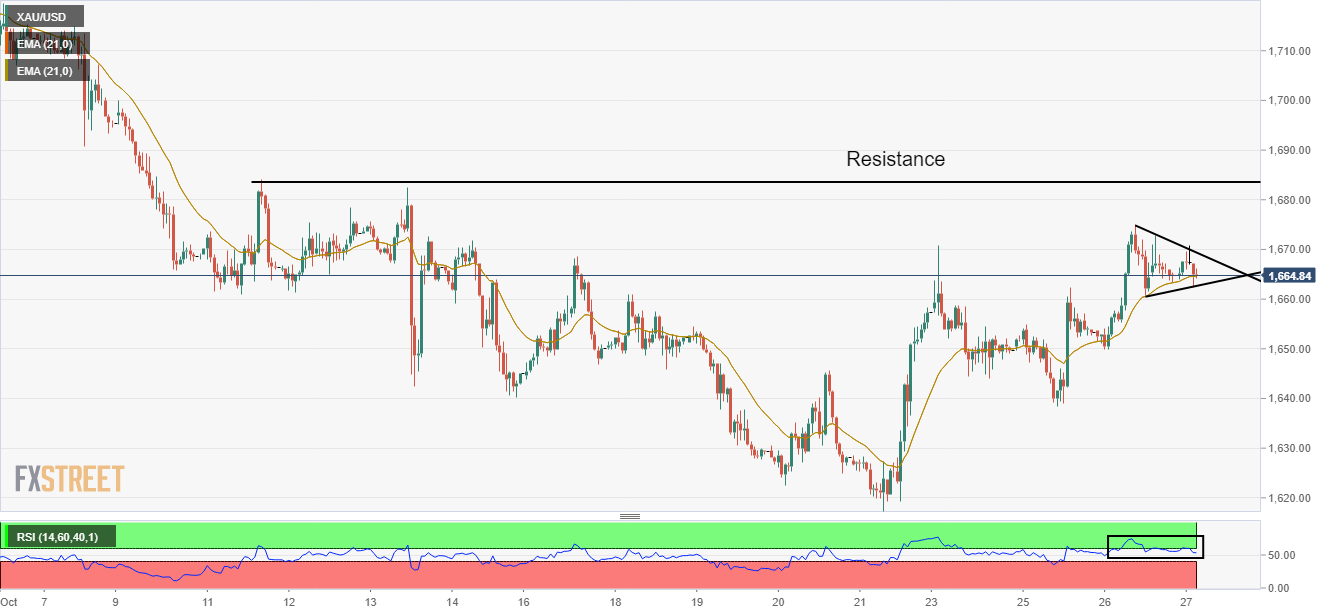 قیمت طلا در یک مثلث متقارن در حال نوسان است که نشان دهنده انقباض محض در نوسان است. انفجار الگوی انقباض نوسانات منجر به کنه های گسترده تر و حجم سنگین تر می شود. مقاومت افقی از بالاترین قیمت 11 اکتبر در 1684.05 دلار قرار گرفته است.