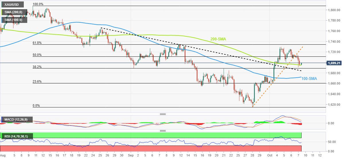 قیمت طلا پس از شکستن خط حمایتی 8 روزه، با حمایت 200-SMA، حدود 1695 دلار در زمان مطبوعات، لاس می‌زند. همچنین امیدوار نگه داشتن خرس‌های XAU/USD، کاهش RSI (14) و سیگنال‌های MACD نزولی است.