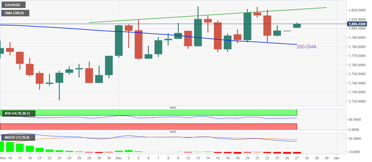 با این حال، سیگنالهای MACD نزولی و یک خط مقاومت شیبدار از 05 دسامبر، نزدیک به 1821 دلار تا زمان چاپ، روند صعودی بیشتر فلز گرانبها را به چالش میکشد.