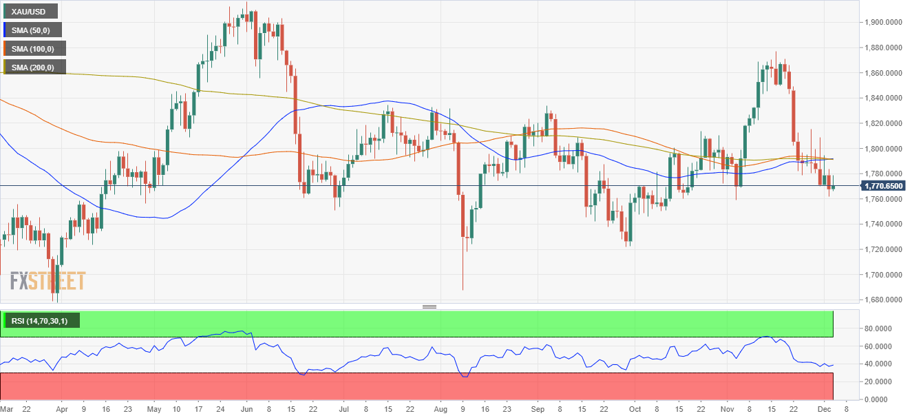 طلا در نمودار روزانه خود مقداری “بلاتکلیفی” و معاملات جانبی را نشان می دهد. با این حال، توجه به این نکته ضروری است که میانگینهای متحرک 200، 50 و 100 روزه (DMA’s) بالاتر از قیمت نقدی قرار دارند و به ترتیب در 1791.01 دلار، 1791.41 دلار و 1790.63 دلار قرار دارند. سناریوی یک متقاطع مرگ، به این معنی که زمانی که 50-DMA از 200-DMA عبور می کند، معمولاً یک سیگنال نزولی، می تواند به واقعیت تبدیل شود، بنابراین تعصب طلا را از نقطه نظر تحلیل تکنیکی تغییر می دهد.