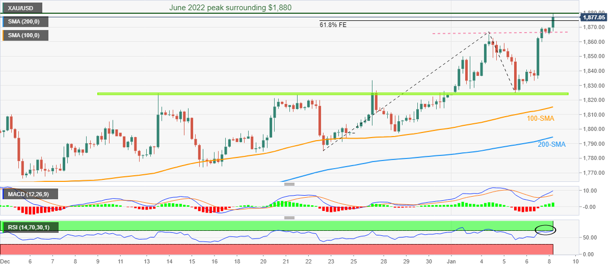 خریداران طلا شکست صعودی بالاترین قیمت هفتگی قبلی را در اطراف 1865 دلار و همچنین رشد فیبوناچی 61.8 درصدی (FE) از 22 دسامبر تا 05 ژانویه، نزدیک به 1875 دلار را تشویق می کنند، زیرا گاوهای XAU/USD با بالاترین حد در ژوئن 2022 حرکت می کنند. 1880 دلار