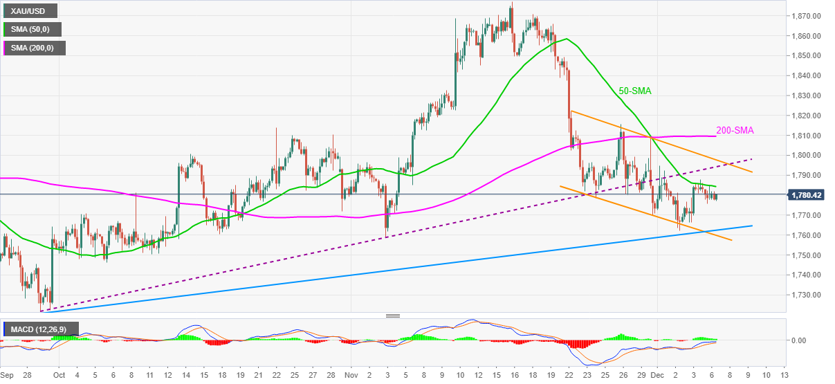 با این حال، آخرین بازگشت مجدد نتوانست بر سطح 50-SMA یعنی 1785 دلار غلبه کند، که حاکی از کاهش دیگری به سمت خط حمایت کانال، نزدیک به 1760 دلار است. افزودن قدرت به حمایت 1761 دلاری، یک خط روند شیب دار صعودی از سپتامبر است.