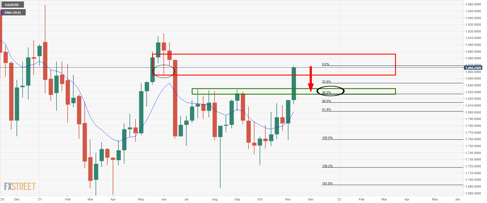 طبق تحلیل قبلی، پیشبینی قیمت طلا: گاو نر میتواند در اینجا دستمالی بزند، قیمت از مقاومت هفتگی که به شرح زیر نشان داده شده بود اصلاح میشود: