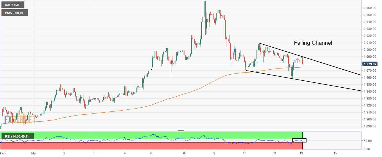 در مقیاس ساعتی، XAU/USD در کانالی در حال نزول حراج میکند که سیگنال حرکتی ضعیف با سوگیری منفی است. این فلز گرانبها حمایت نزدیک به میانگین متحرک نمایی 200 دوره ای (EMA) را در 1975.40 دلار حس کرده است. شاخص قدرت نسبی (RSI) (14) در محدوده 40.00-60.00 در نوسان است که نشان دهنده حرکت عقب و جلو در فلز گرانبها در پیش است.