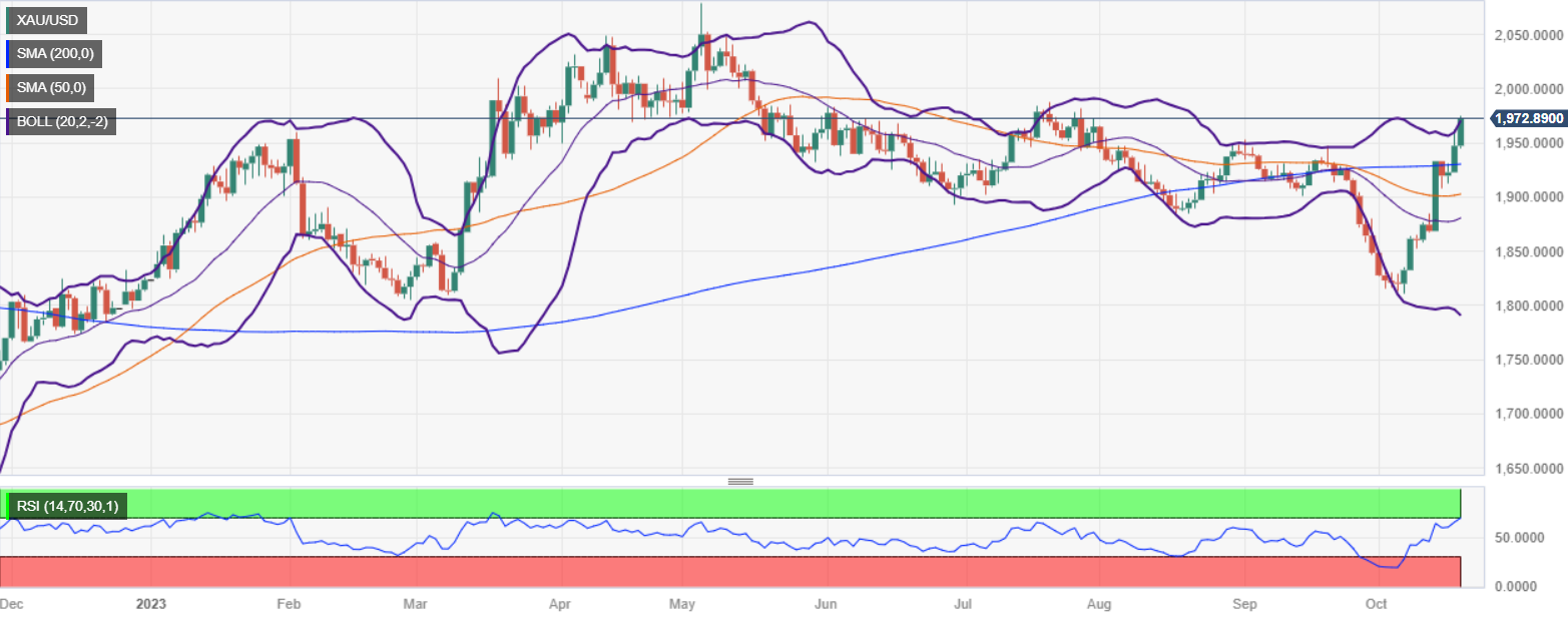 - XAU/USD trades at $1971.15, marking a 1.24% gain.