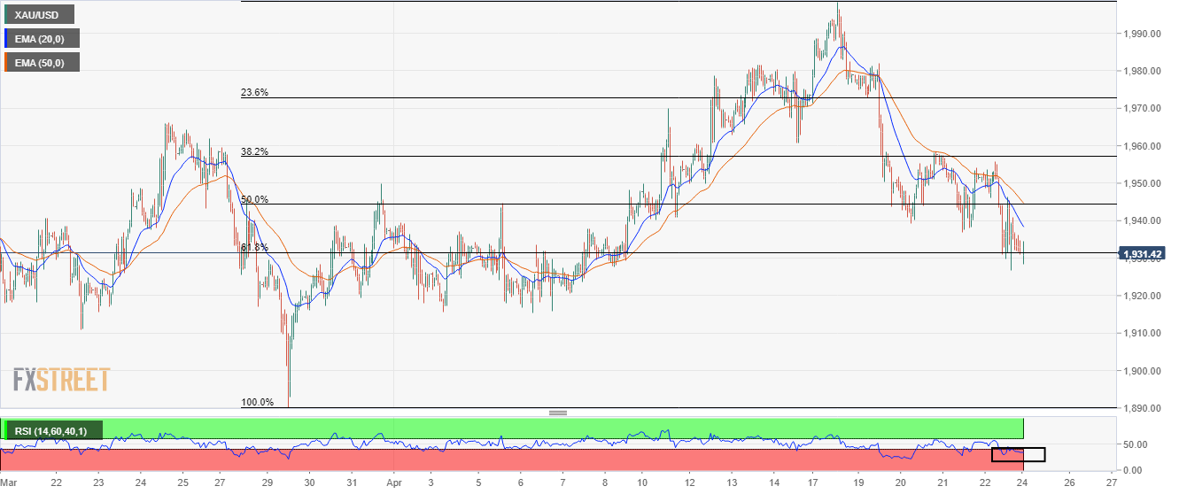 در مقیاس ساعتی، XAU/USD در زیر 61.8% فیبوناچی اصلاحی (از پایین ترین سطح 29 مارس در 1890.21 دلار تا بالاترین سطح هفته گذشته در 1998.43 دلار) در 1931.56 دلار در نوسان است. میانگینهای متحرک نمایی 20 و 50 دورهای (EMA) در حال مقیاسبندی پایینتر هستند، که به سوگیری نزولی میافزاید. در همین حال، شاخص قدرت نسبی (RSI) (14) به محدوده نزولی 20.00 تا 40.00 تغییر کرده است که نشان دهنده یک موج ضربه ای نزولی تازه در پیش است.